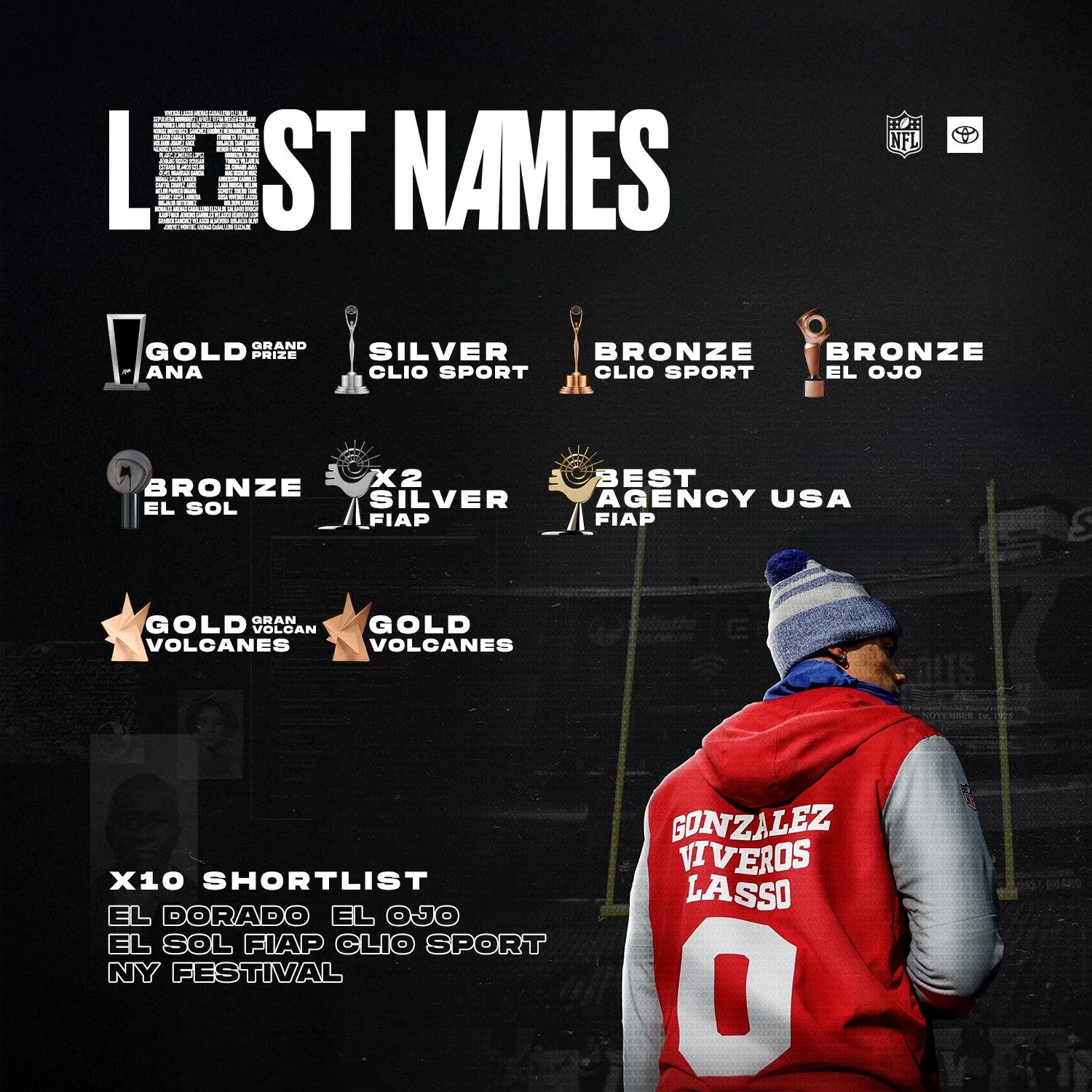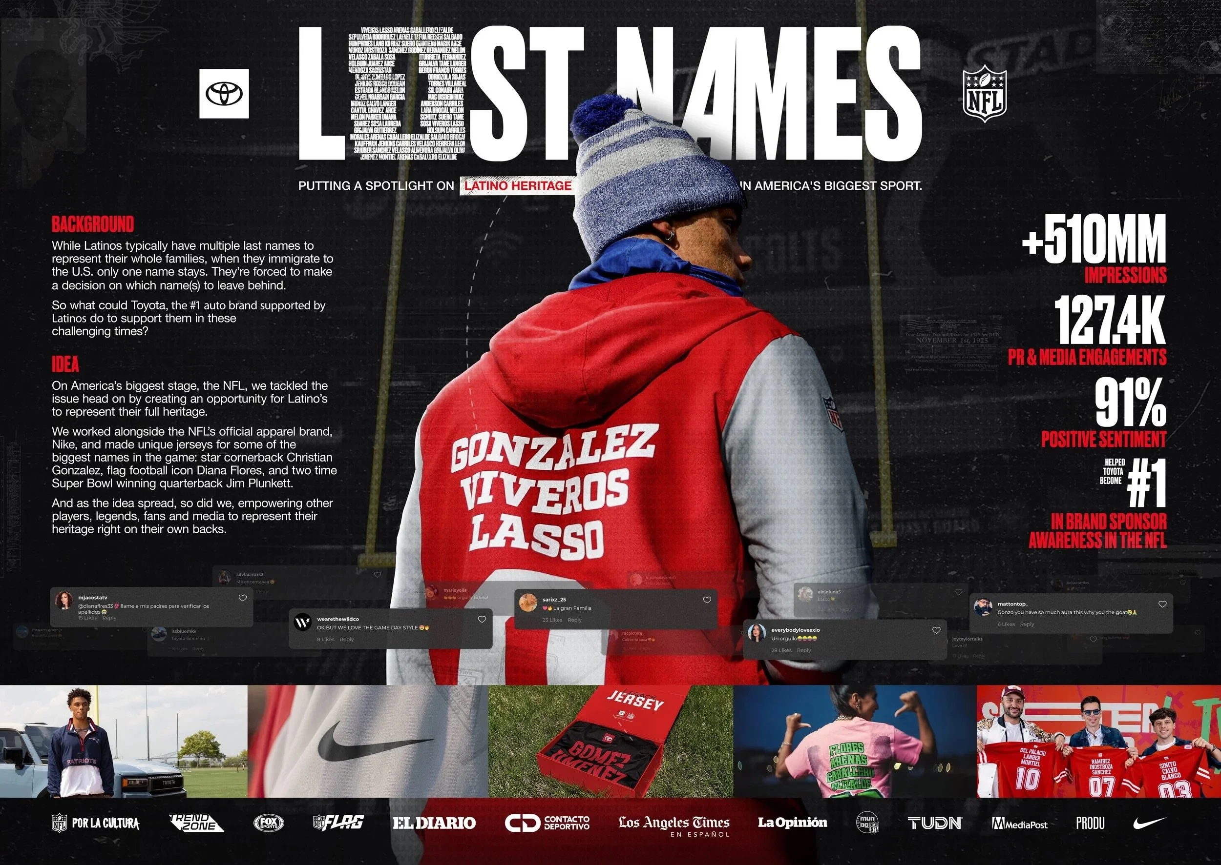 “Lost Names” is a culturally driven campaign that spotlighted Latino heritage in the NFL by addressing a quiet but meaningful reality: many Latinos lose parts of their family identity when forced to simplify their last names in the U.S. Partnering with the NFL and Nike, Toyota transformed jerseys into symbols of pride, allowing players to wear their full, ancestral last names on one of America’s biggest stages.